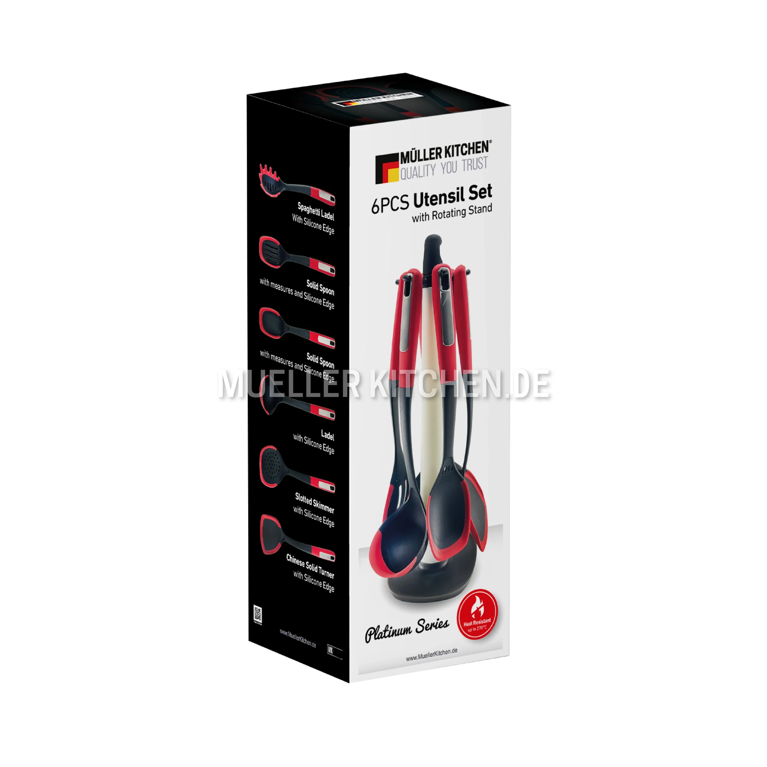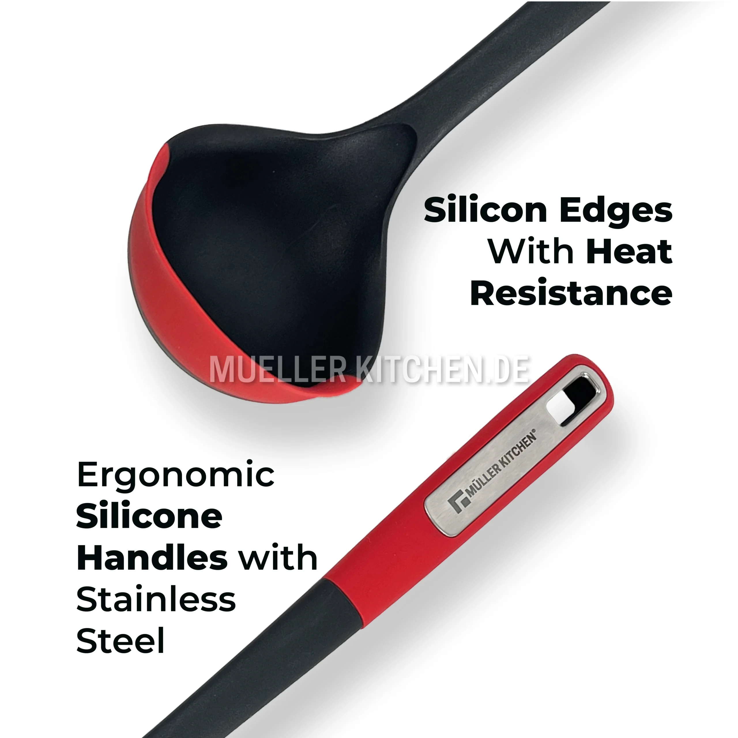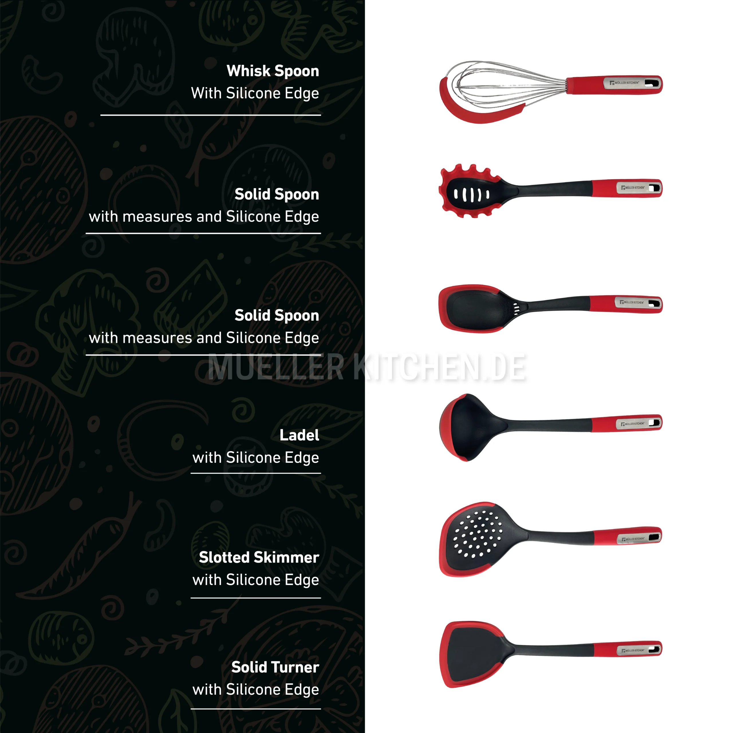 The silicone edges are heat resistant up to 270 degrees Celsius, ensuring safe and efficient use with hot and cold food. The comfortable, non-slip silicone handles provide a secure grip, reducing hand fatigue and strain. Each utensil features a durable stainless steel core for durability and strength. The included holder allows easy storage and access to your utensils, keeping your kitchen organized and clutter-free.