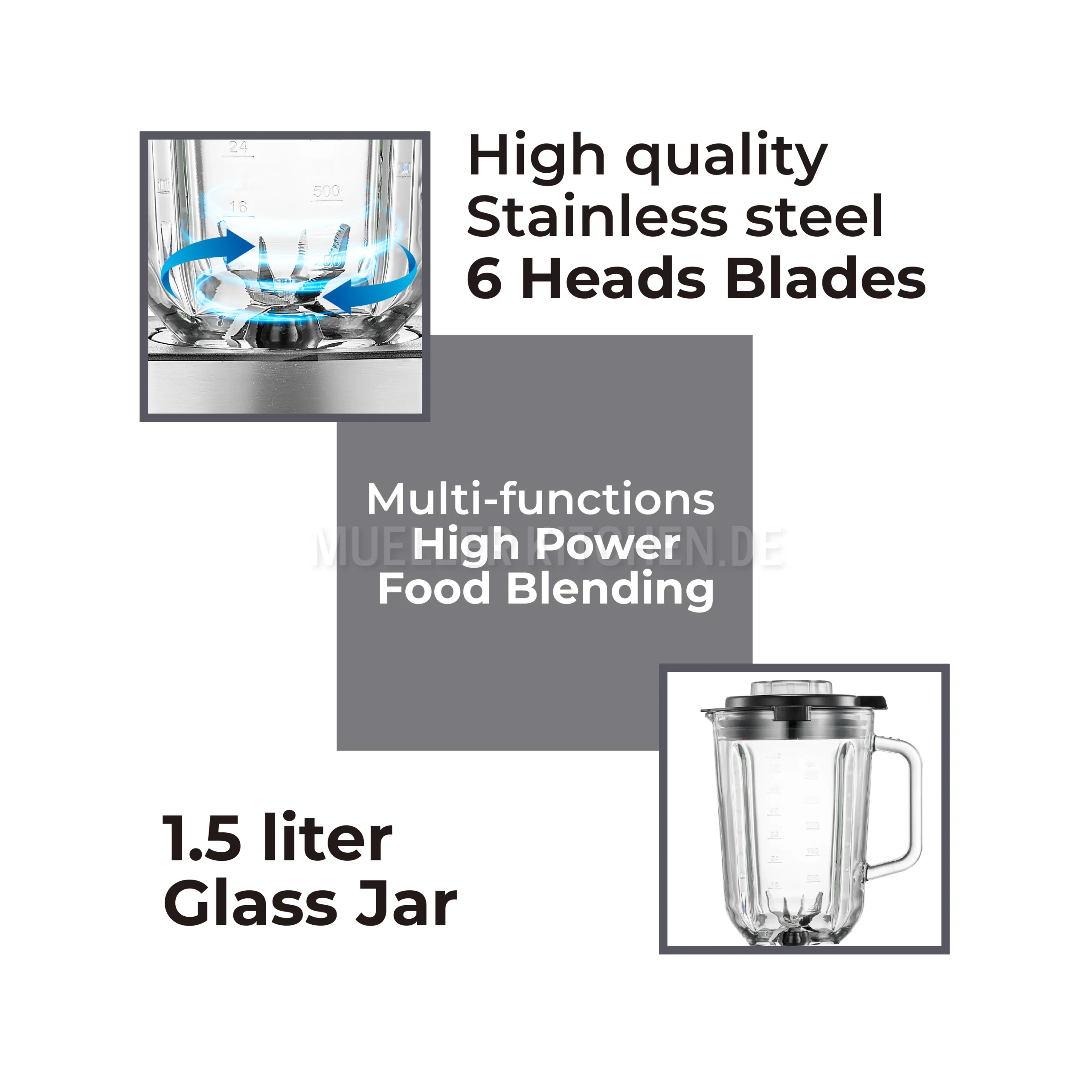 Equipped with a powerful 1000W motor, this blender effortlessly addresses a variety of tasks. From ice crushing to smoothie blending and soup puree, it delivers exceptional performance with speed and accuracy. The 1.5L glass jug is ideal for creating large quantities of your favorite drinks and dishes, making it perfect for families.